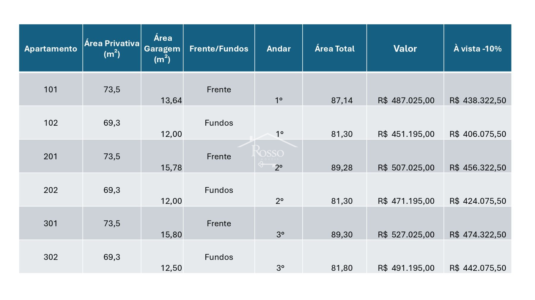 - Apartamento 301 - no 3º andar com 89,30m² de área total sendo 73,5m² área privativa e 15,80m² área de garagem com valor de R$ 527.025,00 (R$ 474.322,50 à vista -10%).